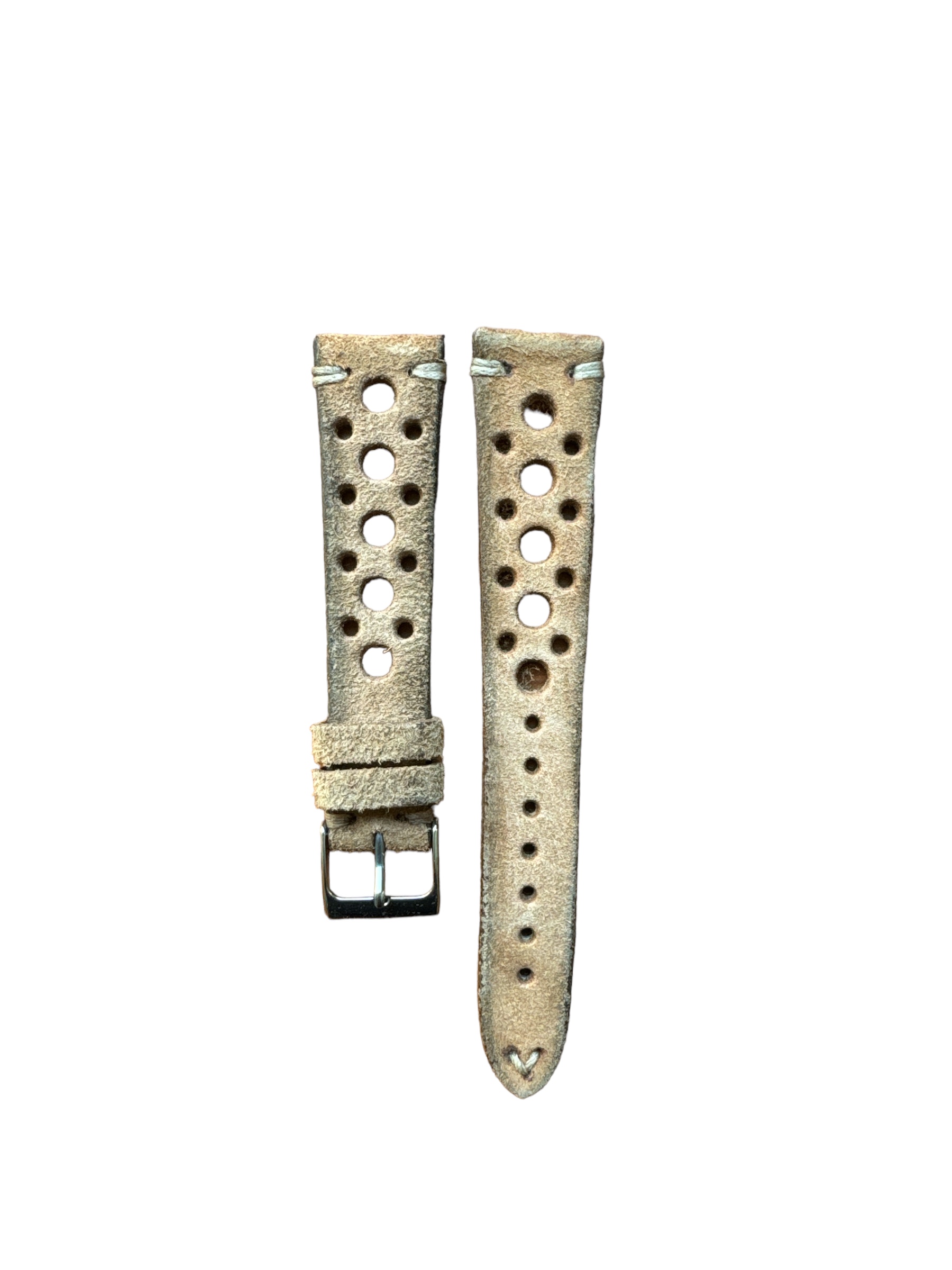 Cinturino Vintage “Rally” con fori di diverse dimensioni. Un tuffo nel passato, sia per quanto riguarda il design che i materiali (vitello e camoscio nei colori anni ’60).