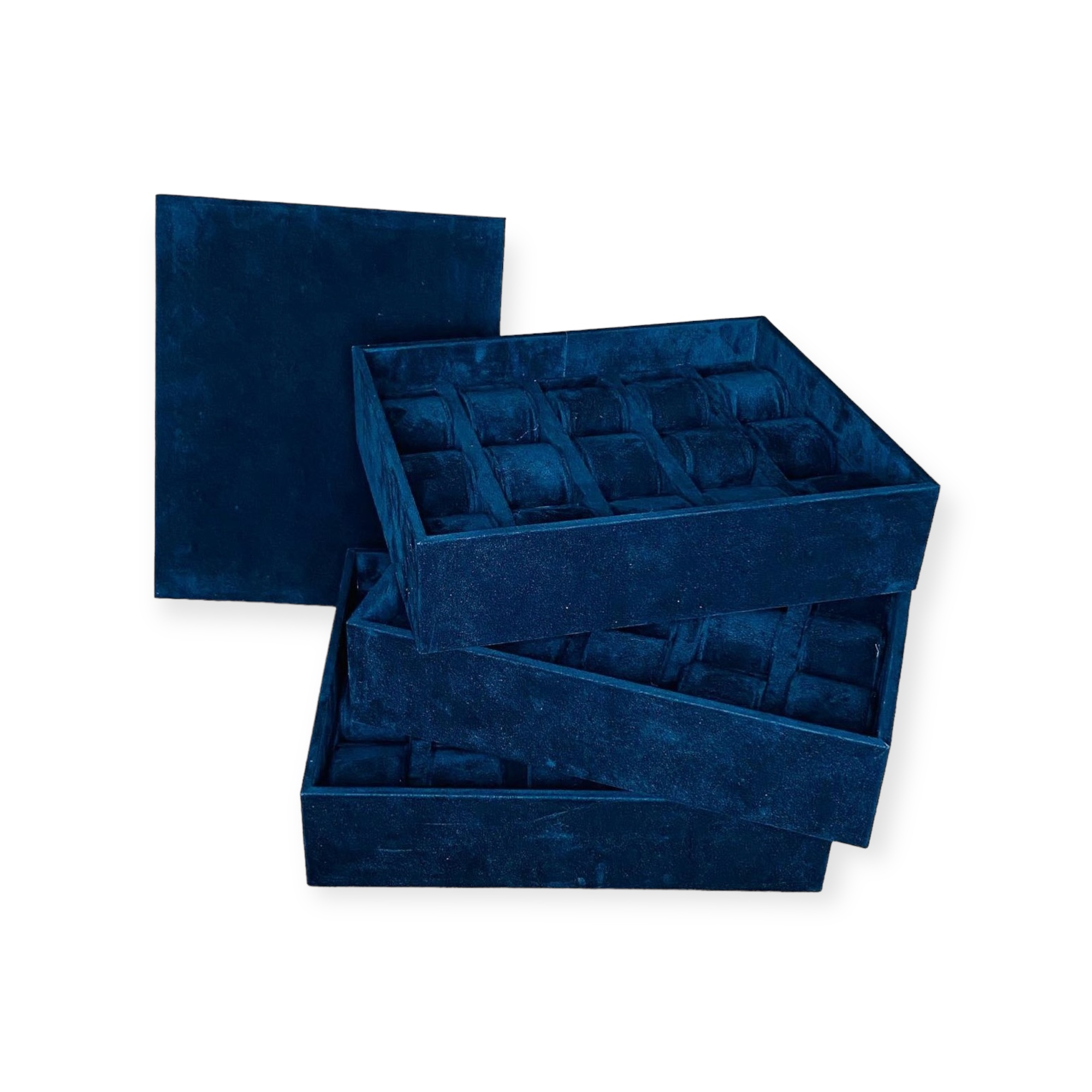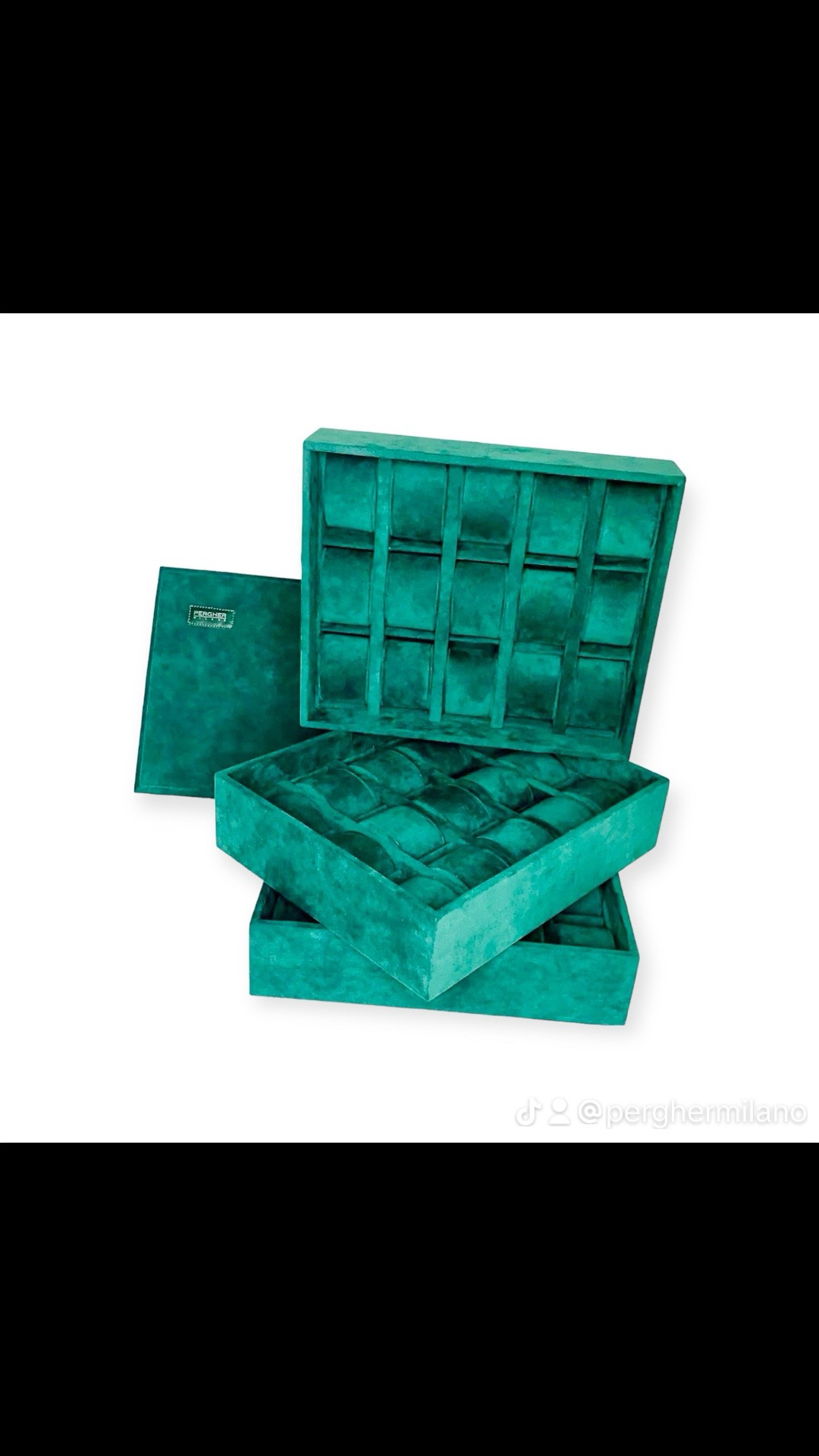 Set di 3 vassoi per orologi in velluto verde. Ognuno di essi è impilabile all’altro, con coperchio in velluto di protezione. Ogni vassoio è composto da 15 ovali in velluto.Il set viene consegnato in una pratica borsa per il trasporto.